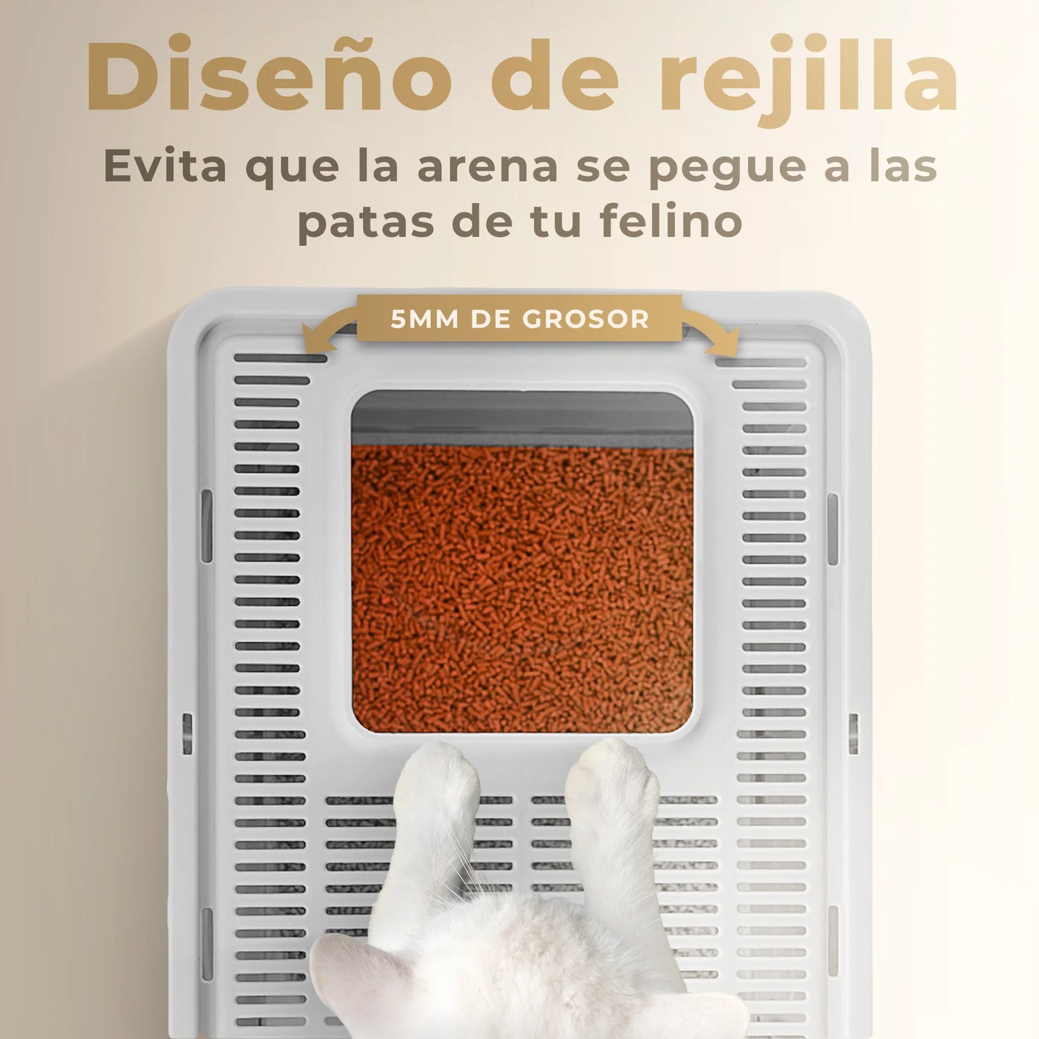 Gracias a su bandeja extraíble en forma de cajón y la cuchara incluida, limpiar la caja de arena es mucho más sencillo. La alfombrilla antideslizante atrapa la arena que el gato podría llevar fuera, y además, puede usarse debajo de otros elementos para evitar derrames.