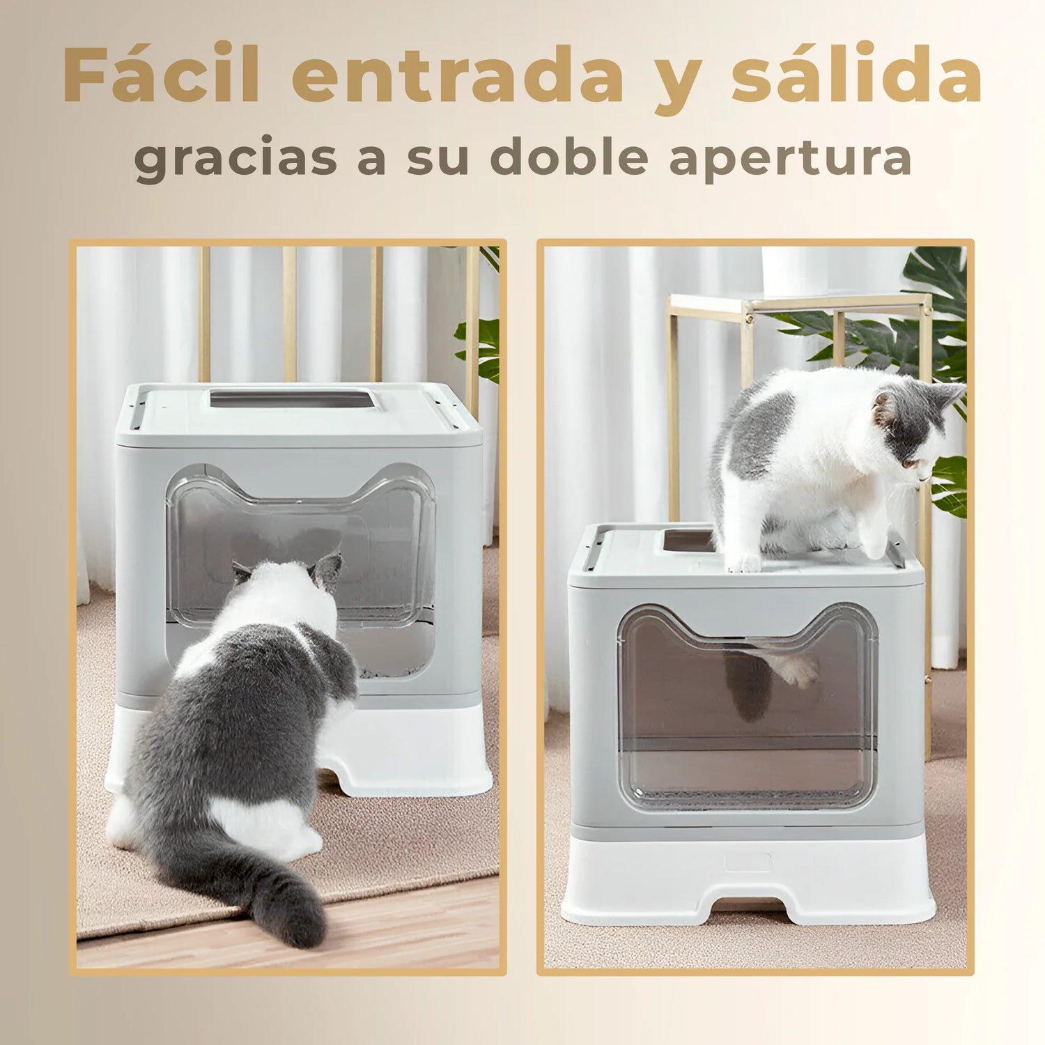La caja de arena para gatos cuenta con un diseño cerrado de entrada frontal y superior que ayuda a mantener el olor y la suciedad en el interior. Con su pedal superior, evita que la arena se disperse por todas partes, conservando tu hogar limpio y libre de malos olores.